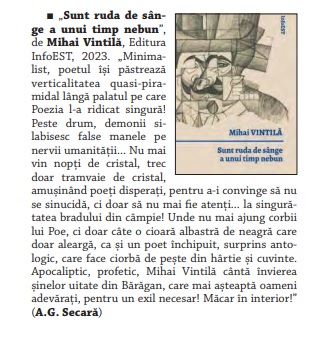 Pagina de pornireliterare Semnal in Caiete Silvane 220 miercuri, mai 10, 2023 Revista Caiete Silvane nr 220, mai 2023, publică în cadrul rubricii Malaxorul de mai un semnal volumului meu Sunt ruda de sânge a unui timp nebun semnat de a.g.secară . Tags: literare personale Facebook Twitter